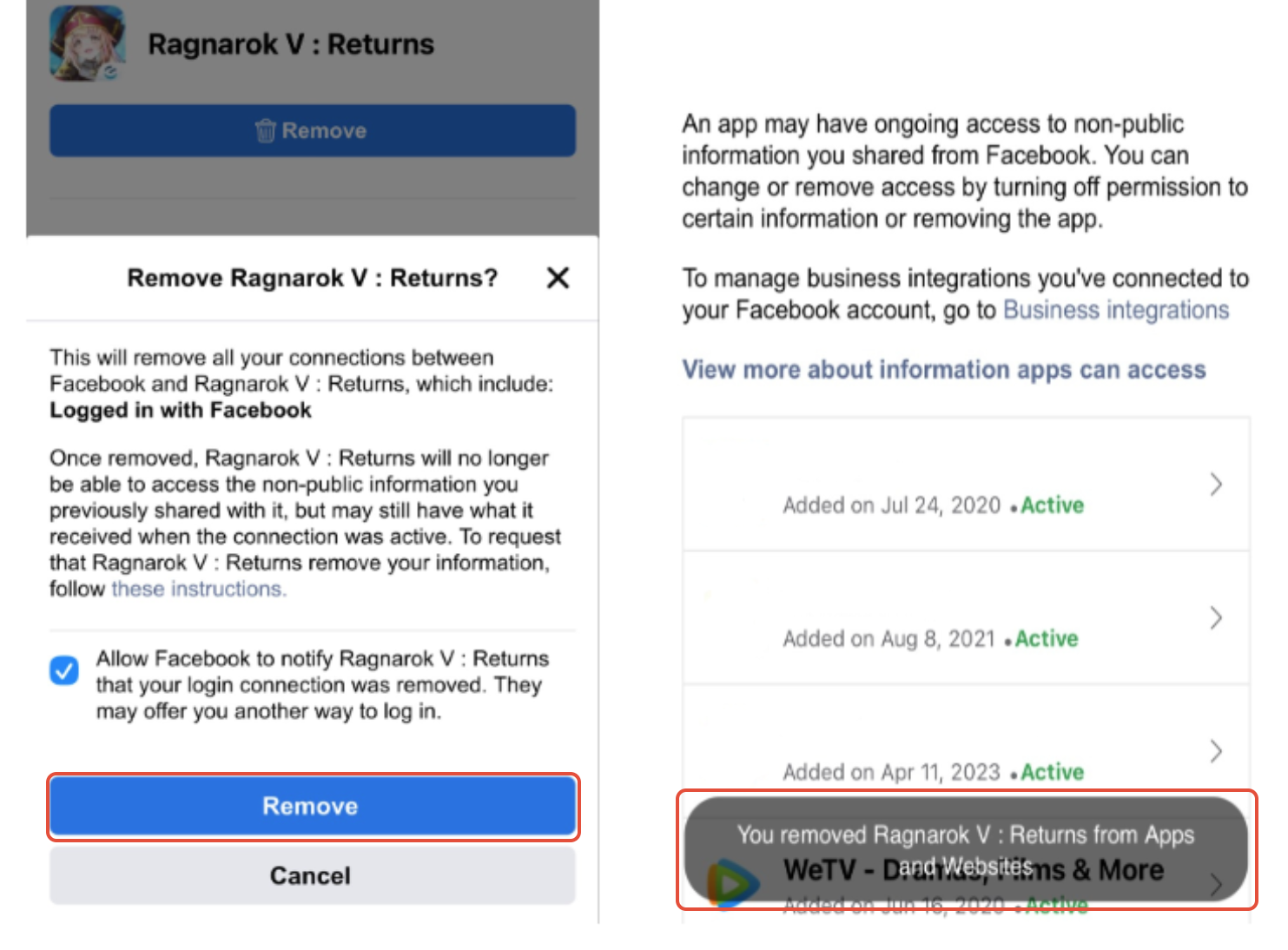 5. A confirmation window will appear showing details of the selected application. To proceed, confirm the deletion by tapping the Remove button again. The system will then notify you that the application data has been successfully removed from Facebook.
